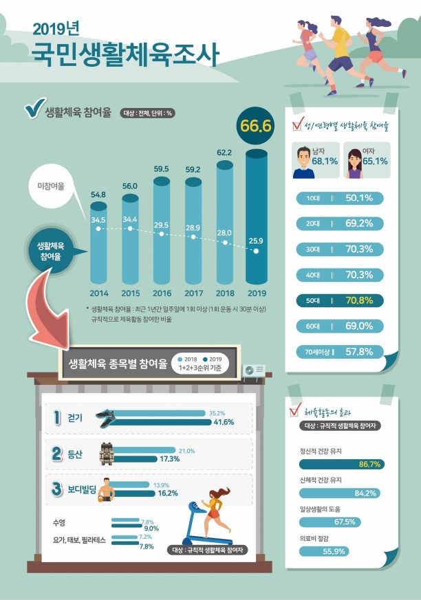 그리고 체육활동을 통해 수많은 효과를 기대할 수 있다면 그에 따른 보상이 필요하다고 생각한다. 체육을 만병통치약인 것처럼 활용하고 싶지만 그 역할을 하는 사람들의 처우는 굉장히 열악한 실정이다. 체육교사의 업무는 과중되고 스포츠강사는 고용이 불안정하다. 생활체육지도자는 최저시급 수준의 비정규직으로 근무한다. 하지만 이들이 우리나라 체육 정책을 수행하는 주요 근로자들이다. 체육 전공 학생들과 학부모들이 묻는다. “체육을 전공하면 어떤 진로를 선택할 수 있나요?” 갈 수 있는 곳은 많다. 생활체육지도자, 헬스트레이너, 요가·필라테스강사, 수영강사, 축구·농구·배구·야구 등 구기 종목 강사 등⋯. 하지만 어느 하나 선뜻 추천해주기 어렵다. 국민체육진흥공단, 대한체육회, 메이저 종목의 종목협회, 프로스포츠 구단 등 극소수의 일자리를 제외하고 위에 언급한 보편적이고 일반적인 체육 분야의 직업은 모두 프리랜서 개념의 비정규직 일자리이기 때문이다. 정기적인 체육활동은 의료비 절감으로 이어진다고 한다. 그 수치는 우리나라 인구 중 생활체육 참가자가 10% 증가할 경우 연 1조원의 의료비가 절감하게 된다고 한다(고광욱, 2006). 생활체육참여율은 2018년 62.2%에서 66.6%로 4.4% 포인트 올랐다. 단순 계산해보면 4,400억 원의 의료비가 절감된 것이다. 과연 이 중 얼마의 재원이 다시 체육 분야로 투자되었을까? 체육 활동으로 인해 절감된 의료비가 전부는 아니더라도 일정부분 체육으로 재투자되는 선순환 체계를 갖춘다면 체육 분야의 일자리 또한 점점 안정적으로 발전할 수 있을 것으로 생각된다. 그렇게 된다면 학교체육 현장에서 체육에 대한 인식과 활동 또한 동반 성장할 것이다.<출처: MBN뉴스(2017)>