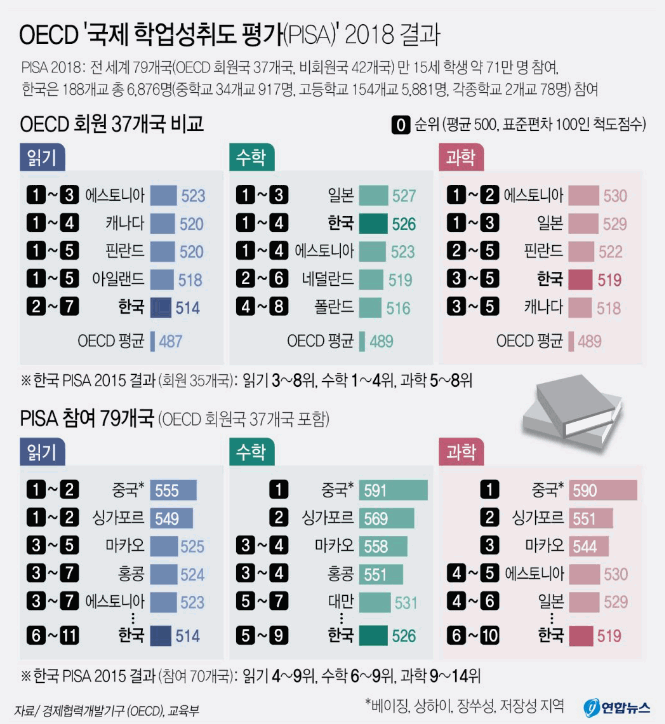 연합뉴스(2018). OECD '국제 학업성취도 평가(PISA)' 2018 결과. 2019.12.03. 연합뉴스, 김영은.